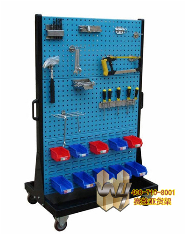 物料整理架是由方孔掛板、百頁掛板、背掛零件盒、棚板、各類掛鉤和底座等組成,廣泛應(yīng)用于車間的生產(chǎn)、裝配、維修工位,也廣泛應(yīng)用于倉庫,存放多品種少量 的小型物料和工具。物料整理架結(jié)合背掛零件盒及多用途的掛鉤配件,不但適合各種類型的物料整理,更適合小型物料工具、零件及各種異型物品的保管分類,充分 有效的運用空間。根據(jù)不同的要求可分為移動型、獨立型、連接型。物料整理架從功能上可以分成移動式物料整理架和固定式物料整理架;從結(jié)構(gòu)設(shè)計上又能分為單 面物料整理架和雙面物料整理架。賽維亞金屬制品有限公司所生產(chǎn)的移動式雙面物料整理架規(guī)為:L910*W560*H1560,可以安裝3塊掛板。掛板分為方孔掛板和百葉掛板,方孔掛板配合掛鉤是用來存放工具,百葉掛板配合掛板零件盒放置小零件;加裝的3塊掛板可以根據(jù)客戶的需求來設(shè)計。